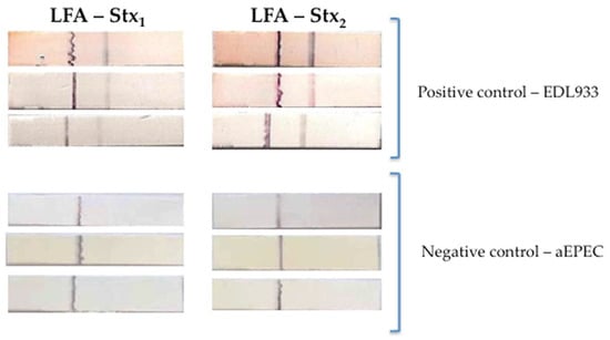 Due to the feasibility of LFA, the LFA-Stx1 and LFA-Stx2 we consider that it can be used as a rapid test, such as described elsewhere [58,59], since it did not require expensive equipment or trained personnel to interpret the results. Unlike ELISA or PCR methods, colloidal gold technology can be used for point-of-care applications and screening as they require the only assessment of red colored lines for the end-point detection. Both standardized methods are reproducible, fast, easy to perform, showing high sensitivity in detecting Stx.