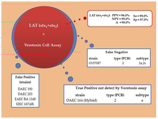 Regarding the sensitivity and specificity of the latex agglutination assay, LAT-Stx1 (94 and 91%); LAT-Stx2 (96 and 93.5%), respectively, but when both mAbs were combined these results reached to 99 and 97%, respectively. Our results cannot be compared to those of the reverse passive latex agglutination kits (VTEC-RPLA toxin detection and VTECRPLA “Seiken”, Japan) since they were no longer commercially accessible. Early diagnosis of diarrhea is the key to therapeutic behavior, accordingly, for a diagnostic assessment method we may employed RALT for EspB (97% sensitivity and 98% specificity) [48] and LAT-Stx (99% sensitivity and 97% specificity), so we may define in a short term if the diarrhea was due to EPEC/EHEC or STEC. Only one false negative occurred and five false-positives, in fact, among them, one strain initially described as the adherent diffuse E. coli (DAEC) by the daaC probe [42]. Herein it is a real positive, detected by PCR as Stx2e, but a non-producer Stx by VCA. Moreover, no cross-reaction was observed neither with E. coli negative for the DEC virulence factors nor with the microbiota strains and among the enterobacterial species.