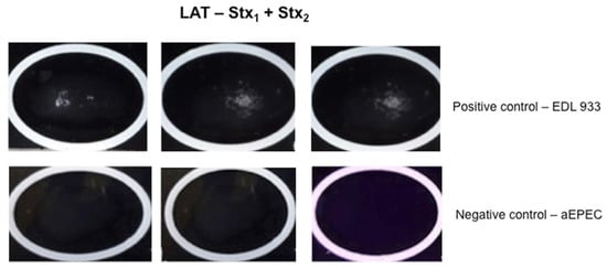Representative image of positive (EDL 933 – O157:H7) and negative (atypical EPEC–aEPEC – O127:H7) controls strains in a latex agglutination test (LAT) employing Stx1 and Stx2 antibodies. Triplicates of each experiment.