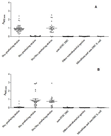 In the cEIA, the Stx1 Abs (mAb and pAb) were able to recognize the Stx1 producers, showing 95.5% of sensitivity and 97% of specificity and an A492nm of 0.195 cut off (Figure 6A) and Stx2 Abs (mAb and pAb) were able to recognize the Stx2 producing strains, showing 92% of sensitivity and 100% of specificity and an A492nm of 0.1205 cut off (Figure 6B).