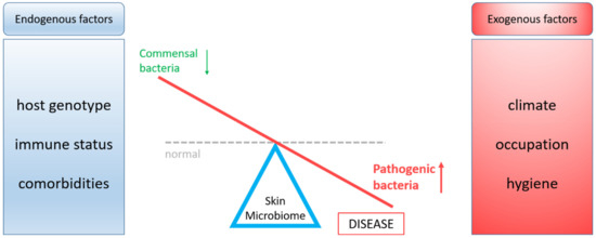 In healthy individuals, there is a balance between essential and opportunistic bacteria, while in a pathological state dysbiosis occurs. The balance between beneficial and pathogenic skin bacteria can be disturbed by endogenous or exogenous factors (Figure 1) [11]. The current modern lifestyle habits (e.g., diet, stress, and sedentariness) can change the microbiota composition and may lead to disturbances of immune system homeostasis [12,13,14].