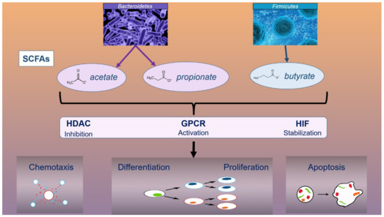 Short chain fatty acids (SCFAs) have an immunomodulatory effect which can be explained by cellular processes in which SFCAs are involved. These cellular processes include chemotaxis, differentiation, proliferation, and apoptosis, all of which occur as a result of the influence of SFCAs on several signaling pathways: inhibition of histone deacetylases (HDAC), activation of G protein coupled receptors (GPCR), and stabilization of the hypoxia-inducible factor (HIF) (Figure 2) [62,63]. SCFAs inhibit the secretion of inflammatory cytokines (TNF-α, IL-6, IL-17, IFN-γ), likely by lipopolysaccharide (LPS)-induced chemokines and cytokines, and modulate the ratio between good and pathogenic bacteria by suppressing the overgrowth of pathogens [64,65].