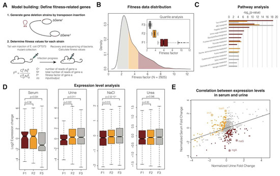 Schematics of the experimental design, fitness definition and gene expression analysis. (A) To determine the fitness of each gene in the E. coli CFT073 genome, transposons are inserted at random in the genome, generating a pool of mutants that can be characterized by sequencing. To determine the contribution of each gene to the fitness of the organism, this mutant pool can be injected in mice and any remaining bacteria recovered and sequenced after infection. Those mutants unable to infect the host will be depleted from the output pool compared to the input pool (fitness values > 1). (B) Density plot showing the distribution of the calculated fitness values. Genes were classified according to quartiles; F1 genes correspond to the first quartile (dark red), F2 genes to the third quartile (orange) and grey genes to both the first and second quartiles (grey). The distribution of fitness values for each gene group is depicted as a boxplot in the insert. (C) Pathway analysis enrichment for each gene group. p-values are represented for each group and pathway (only significant pathways with an adjusted p-value < 0.05 using the Benjamini-Hochberg correction are shown in the figure). (D) Expression levels for genes in four different conditions: serum, urine, sodium chloride (NaCl) and urea. Statistical analyses were performed using the Mann-Whitney U-test and p-values corresponding to all the comparisons are shown in the figure. The median value for each group of proteins is shown with a horizontal black line. Boxes represent values between the first and third quartiles. All the values outside this range are considered to be outliers and were removed to improve visualization. The notches correspond to a ~95% confidence interval for the median. (E) Correlation of gene expression levels between serum and urine. Expression levels were first normalized using z-scores. Differentially expressed genes between serum and urine are highlighted in orange (>two-fold rank increase in serum compared to urine) and red (> two-fold rank increase in urine compared to serum). Some exemplars in both sets are highlighted in the figure.