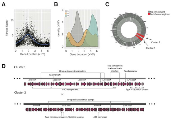 Gene localization analysis and fitness enrichment in the E. coli genome. (A) Distribution of fitness factors along the E. coli CFT073 genome (B) Genome localization of genes according to the fitness classification (F1 genes in grey, F2 genes in orange and F3 genes in green). (C) Positional enrichment analysis of fitness-related genes in the genome. According to WoPPER, two clusters of genes were identified. The functional enrichment of both clusters was weak due to a high number of uncharacterized and hypothetical proteins. (D) Detail of the two clusters identified by positional enrichment. Some proteins belonging to the F1 main functional categories were identified in both clusters and are highlighted as exemplars in the figure, e.g., two-component system and ABC transporters.