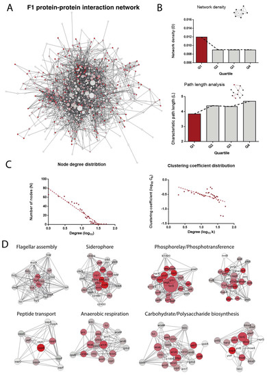 First, we observed that the network density (a measure to calculate how the network is populated by edges) for proteins belonging to F1 is higher than for the other groups (F2 and F3, Figure 3b). This is also true for the average path length in the network that measures the expected distance between two nodes and how fast the information can travel in the network (Figure 3b). These results suggest that proteins that are most relevant for bacteremia (i.e., those having a high impact on fitness) are more interconnected than the remaining genes. When analyzing the properties of the F1 network, we observed that the topology of the network is compatible with small-world networks (Figure 3c). This network also shows a moderate degree of hierarchy, which makes it possible to identify modules in the network (Figure 3c). These modules are also associated with functions relevant to bacteremia (Figure 3d): peptide transport is intimately related to antimicrobial peptide resistance; flagellar assembly is activated for infection of host cells; siderophore expression is crucial in the uptake of iron; and phosphotransference is associated with changes in protein regulation and may be important when it comes to activating the cascades required for survival. Moreover, metabolic changes must occur, as the bacteria are growing in a very different environment.