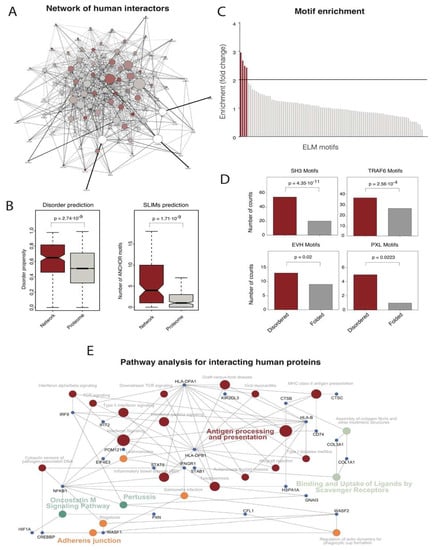 Characteristics of human protein targeted by E. coli. (A) Representation of the E. coli-H. sapiens protein-protein interaction network of genes belonging to the F1 group based on data deposited in the String database. (B) Distributions of disorder propensity and the number of ANCHOR motifs in human proteins targeted by E. coli CFT073 F1 proteins compared to the human proteome. (C) Enrichment analysis of ELM motifs in human proteins targeted by E. coli CFT073 F1 proteins compared to the human proteome. The number of ELM signatures for all the human proteins was calculated, as was the ratio between the observed motifs in the human proteins targeted by the E. coli CFT073 F1 proteins and the human proteome counts. Motifs with > two-fold enrichment are colored in dark red. (D) Distribution of enriched motifs in human proteins targeted by E. coli CFT073 F1 proteins between folded and disordered regions. In all cases, statistical analyses were performed using the Mann-Whitney U-test and p-values corresponding to all the comparisons are shown in the figure. The median value for each group of proteins is shown with a horizontal black line. Boxes represent values between the first and third quartiles. All values outside this range are considered to be outliers and were removed to improve visualization. The notches correspond to a ~95% confidence interval for the median. (E) Pathway enrichment analysis (colored circles) for human proteins targeted by E. coli CFT073 proteins. Most relevant proteins connecting all pathways are shown as blue circles and labelled with the protein name.
