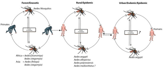 A few hundred years ago, dengue was primarily a sylvatic disease. The sylvatic cycle is ecologically and evolutionarily-distinct from the human transmission cycle, causing sporadic outbreaks in humans [33,34]. A sylvatic cycle that serves as an enzootic cycle involving canopy-dwelling Aedes mosquitoes and lower primates for dengue transmission has been well-documented in the rainforests of western Africa and Southeast Asia, including Peninsular Malaysia and eastern Senegal [6,33]. Aedes luteocephalus, A. furcifer, and A. taylori were the principal transmission vectors in Africa [35,36,37,38,39], and the primatophilic canopy-dwelling mosquitoes of the A. niveus s.l. complex—a group that includes Aedes pseudoniveus, Aedes subniveus, Aedes vanus, Aedes albolateralis, Aedes niveoidesan, and Aedes novoniveus—were the principal vectors in Asia (Figure 1) [40]. In other locations in tropical Africa and Asia, probable rates of sylvatic DENV transmission to humans are unknown, but appeared to be minimal [41,42]. In North America, several species of new-world non-human primates were found to be resistant to DENV infection, and no cases of sylvatic DENV transmission were recorded. Similarly, no evidence of enzootic circulation through lower primates have been found in Panama [43]. However, seroconversions among indigenous Ayoreo Indians living in an isolated forested region of Bolivia, where A. aegypti is absent, recommend that sylvatic DENV transmission may happen in the region [44]. Cross-species transmission of DENV in rural areas of Africa and Asia from non-human primates to humans tends to occur when great numbers of the enzootic vector(s) are present [45]. The sylvan environments in rural areas of Africa and Asia can be a source of an abundant amount of primary vector A. albopictus, which is responsible for the transfer of the virus into human habitats [46]. Endemic/epidemic cycles involved the human host, and viruses are transmitted mainly by A. aegypti, A. albopictus, and other mosquitos that serve as secondary vectors, such as A. mediovittatus, Aedes polynesiensis and other members of Aedes scutellarin [47,48].