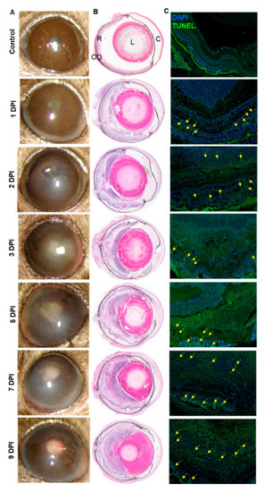 Wild type (WT) C57BL/6 (B6) mice eyes (n = 12 each time point) were infected with Aspergillus fumigatus spores (15,000 colony forming units (CFU)/eye) by intravitreal injections. Phosphate-buffered saline (PBS) injected eyes were used as control. (A) Slit-lamp examination was performed at indicated time points and photomicrographs were taken from representative eyes. (B) For histological analysis, eyes were enucleated at indicated time points and subjected to hematoxylin and eosin (H&E) staining. (C) To evaluate retinal cell death, retinal cryosections were subjected to TUNEL staining (TUNEL positive cells shown by the yellow arrow) at indicated time points. R: retina, OD: optic disc, L: lens, C: cornea.