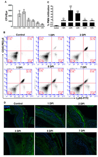 To determine the fungal growth, serial dilution and plate counting were performed on enucleated eyes at various days post-infection (DPI), and our data showed that fungal burden modestly increased at 2 DPI followed by a gradual decline (Figure 2A). Since neutrophils are the main innate immune cells recruited in response to microbial infection, the flowcytometry analysis was performed to assess neutrophil infiltration (Figure 2B). Similar to the fungal burden, our data showed that neutrophil infiltration peaked at 2 DPI and declined at later time points (3–7 DPI), but remains significantly higher as compared to uninfected control eyes (Figure 2C). Immunostaining also confirmed the presence of PMNs in infected mouse retinal tissue, as evidenced by increased staining of Ly6G positive cells (Figure 2D). These results indicate a direct correlation between fungal load and increased neutrophil infiltration in AF endophthalmitis.