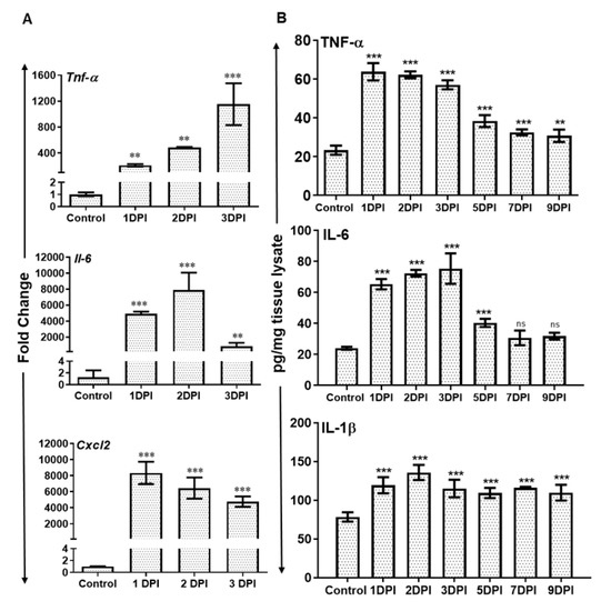 The recruitment of neutrophils is a dynamic process regulated by the production of inflammatory chemokine and cytokines. Therefore, we assessed the expression of various inflammatory mediators at transcripts as well as protein levels. The qRT-PCR analysis revealed significantly increased mRNA levels of several inflammatory cytokines and chemokines e.g., Tnf α, Il-6, and Cxcl2 in AF-infected retina (Figure 3A). Tnf α transcripts showed time-dependent increased expression while the transcripts of Il-6 and Cxcl2 peaked at 2 and 1 DPI respectively and slightly declined thereafter.
