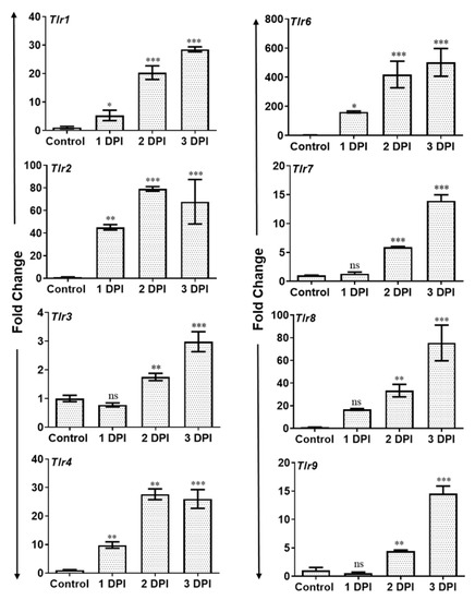 Activation of Toll-like receptors (TLRs) following pathogen challenge plays an important role in the initiation of the early innate immune response against microbial infections. Since we observed PMN infiltration and induction of inflammatory mediators in AF-infected eyes, we assessed the expression of TLRs using qRT-PCR. To this end, our results show that AF infection resulted in a significant and time-dependent induced expression of mRNA transcripts of several TLRs including TLR1, 2, 3, 4, 6, 7, 8, and 9 in infected mouse retina (Figure 4).