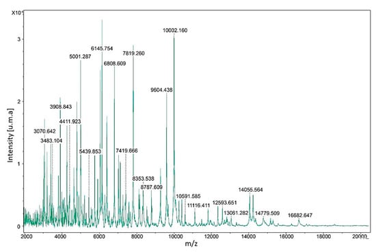 For the identification of clinical isolation by MALDI-TOF MS, four reference spectra were constructed. The range of the masses detected was between 3070.643–16,682.647 Daltons (Figure 2).