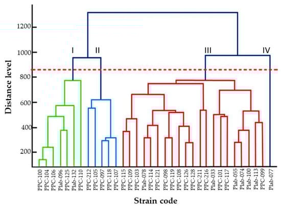 The 34 (100%) clinical isolates were identified through the in-house library as N. dimidiatum (score ≥2.00). The dendrogram created with the protein spectra, using the principal component analysis (PCA) method, shows the conformation of four groups (I to IV) above the critical distance (850), as shown in Figure 3. Groups I to III were formed by seven, five, and 21 isolates, respectively. Group IV was formed by the single isolate Plab-077 (MUM 19.71) with an origin in a nail infection.