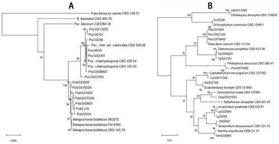 Phylogenetic tree of the Pochonia/Metapochonia spp. (A) and other (B) isolates.