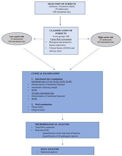 The Microbiota of Interdental Space of Adolescent according to Risk of Caries (MIARC) trial is a cross-sectional observational clinical study. The workflow of the experiment is described in Figure 1.