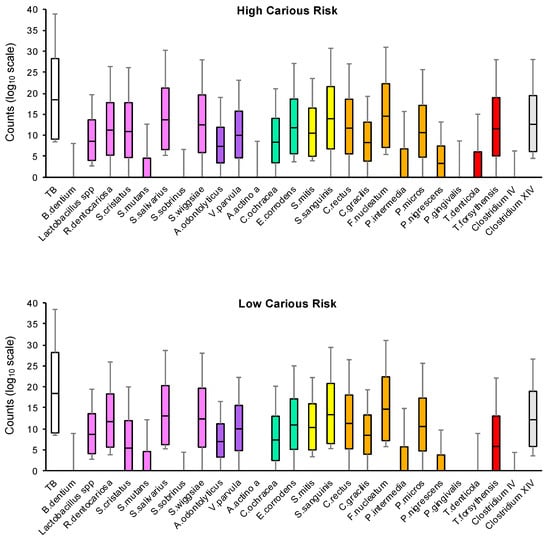Abundance of bacterial species among the interdental sites in the low carious risk and high carious risk groups. The counts are reported on a log10 scale. Each box represents the first quartile, median quartile, and third quartile, from bottom to top. The first box on the left (TB) corresponds to the total bacteria. The colors in boxes refer to (i) the colors of the Socransky complexes for the purple, green, yellow, orange, and red colors, (ii) cariogenic bacteria for the pink color and (iii) bacteria from the clostridium group for the gray color. TB, total bacterial load.