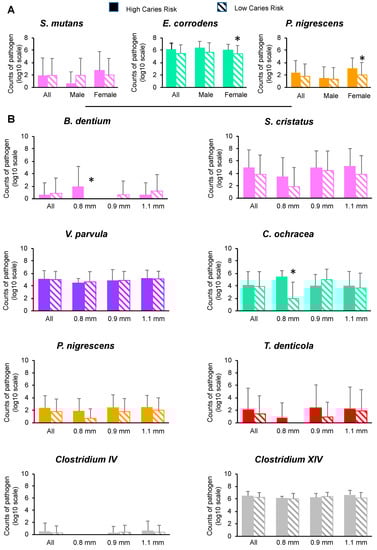 Abundance of bacterial species according to sex and interdental diameter in the low carious risk group and in the high carious risk group. The counts are reported on a log10 scale. Total counts from each pathogen were averaged across sites in each subgroup. Error bars represent standard deviations. This stratified analysis is restricted to those situations where the interaction between caries risk and sex (A) or caries risk and IDB size (B) on bacterial counts is significant (p < 0.05) (detailed results not shown). Comparisons: * p < 0.05, by using SUDAAN 7.0 (procedures DESCRIPT and REGRESS) to account for clustering (multiple sites within the subjects). The colors in boxes refer to (i) the colors of the Socransky complexes for the purple, green, yellow, orange, and red colors, (ii) cariogenic bacteria for the pink color and (iii) bacteria from the clostridium group for the gray color. TB: total bacterial load.