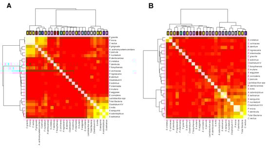 Correlation plot of the abundances of the bacterial species, corrected for age, interdental space and individual-specific effects. (A) High caries risk group, (B) low caries risk group. Yellow indicates positive correlations, whereas red indicates the absence of correlations. The colored leaves on the top dendrogram represent (i) the colors of the Socransky complexes for the purple, green, yellow, orange, and red colors, (ii) cariogenic bacteria for the pink color and (iii) bacteria from the clostridium group for the gray color.