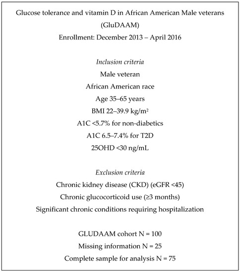 The study participants were African American men (AAM) presenting in ambulatory clinics at an urban Veteran Health Administration Medical Center, as part of the Glucose tolerance and vitamin D in African American Male veterans (GluDAAM) study (Figure 1). GluDAAM is a cross-sectional study assessing metabolic characteristics in African American men (AAM) [34]. The inclusion criteria were glycohemoglobin A1c (HbA1c) < 5.7% without T2D or 6.5%–7.4% with T2D, age 35–70 years, BMI 22–39.9 kg/m2, and 25OH-vitamin D (25OHD) < 30 ng/mL. Exclusion criteria were chronic kidney disease (stages 3b, 4, and 5), chronic glucocorticoid use (3 months or longer), taking non-metformin antihyperglycemics, and presence or history of significant health conditions requiring recent (within 6 months) hospitalization. After providing written informed consent, participants completed a questionnaire that included demographic, lifestyle, and health information. In a single-visit study, personnel captured biometrics (height and weight), and specimens were collected for hormonal and biomarker analysis. Past medical history was confirmed by review of electronic medical records. Lifestyle factors included current smoking (“yes” or “no”) and exercise (“yes” for 2 h or more of exercising per week). A short questionnaire assessed overall dietary habits by a number of servings per week. Foods including fruits, vegetables, nuts, porridge, breakfast cereal, milk, and tea were categorized as “healthy”, whereas servings of potato, fried and canned food, pasta, and soft drinks were categorized as “unhealthy”. The biometric measurements and calculations were performed as previously [34,35], and included body weight, height and body mass index (BMI, kg/m2). The prevalence of chronic conditions, e.g., hypertension, cardiovascular disease, cancer, etc. was assessed by the Charlson index of chronic disease [34,35]. Psychiatric disorders (“yes” or “no”) were included separately because these are not included in the Charlson index and due to the high prevalence of these disorders in the cohort. The measured hormonal levels included testosterone, representing the essential male hormone, and cortisol, representing the stress-related hormone. The Jesse Brown VA Medical Center Institutional Review Board approved the study. The recruitment dates were from 1 December 2013 to 15 April 2016.