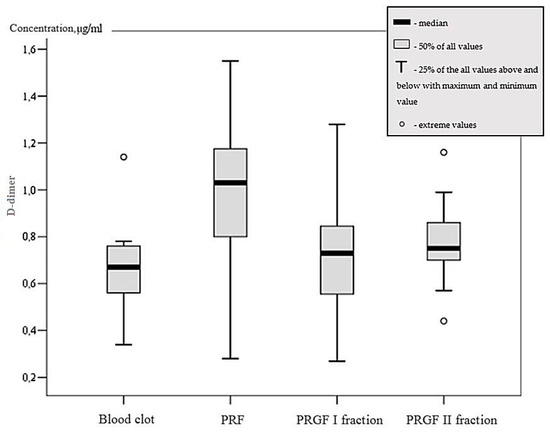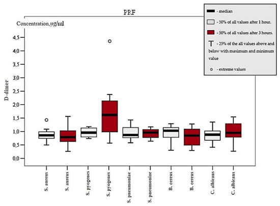 The results were structured into two categories. The first category was evaluated based on the resistance of each medium (blood clot, PRF, PRGF I, PRGF II) to bacteria-induced fibrinolysis and what the d-dimer concentration was in each specific group during the entire timescale. In the second category, bacteria and their fibrinolytic activity were evaluated by highest d-dimer concentration or its change in the presence of a microbe at a specific time.