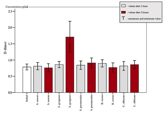 Different types of bacteria expressed diverse fibrinolytic activity based on the medium and time of exposure. S. pneumoniae did not show a statistically significant elevation of d-dimer count after one and three hours in any media groups except for PRF after three hours. Mean d-dimer concentration of 0.89 ± 0.21 µg/mL in the PRF group after three hours was statistically significant, as seen in Figure 2 (p > 0.05). C. albicans had raised d-dimer concentration in PRGF II group after one hour and mean d-dimer concentration was held at 0.7 ± 0.21 µg/mL (p < 0.05). In the PRF group, between the first and third hour, d-dimer concentration elevated by 0.17 ± 0.09 µg/mL (p < 0.05), as seen in Figure 2. After three hours, d-dimer value of 0.96 ± 0.34 µg/mL was statistically significant (p < 0.05) only in the PRF, as seen in Figure 2. A comparison of the PRGF II and PRF groups in the presence of C. albicans identified that Candida bacterium is more active in the PRF medium (p < 0.05). S. aureus and B. cereus increased d-dimer concentration after three hours in PRGF II medium with values of 0.69 ± 0.28 µg/mL and 0.7 ± 0.32 µg/mL respectively (p < 0.05). S. pyogenes exhibited d-dimer raise in all groups after one hour. Mean concentration rise compared with initial value was 0.85 ± 0.83 µg/mL. Between the first and third hours, the mean d-dimer change in concentration was 0.83 ± 0.88 µg/mL. This change was statistically significant (p < 0.05). After three hours of exposure, d-dimer values were statistically higher in comparison with other bacteria. Blood clot d-dimer concentration was 1.6 ± 1.08, PRF was 1.85 ± 1.09, PRGF I was 1.49 ± 1.62, and PRGF II was 1.19 ± 0.3 µg/mL (p < 0.05), as seen in Figure 3. Thus, the observed results regarding S. pyogenes’ fibrinolytic activity indicates that this kind of bacterium is the most active in blood clot and platelet concentrates.