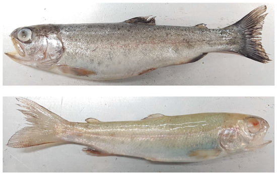 In April 2019, one of the rainbow trout fisheries located in Jeonbuk Province, South Korea requested that we diagnose exophthalmia in rainbow trout fries weighing 10 ± 5 g. The farm consisted of six tanks filled with 5.5 tons of water per tank and approximately 2000 fish were maintained in each water tank. The rearing system in the facility comprised a closed circulating water system supplied by ground water, and the water temperature was maintained at 14–15 °C. Diseased fish showed common signs of progressing keratitis and exophthalmia (Figure 1), loss of appetite, and lethargic swimming activity. The mortality rate was around 7% daily, which was relatively low compared to that caused by other bacterial diseases, but the continuous resulting cumulative mortality rate was over 50% at 10 days before antibiotic treatment. Ten fish were sent for examination at our laboratory and all fish were subjected to post-mortem examination.