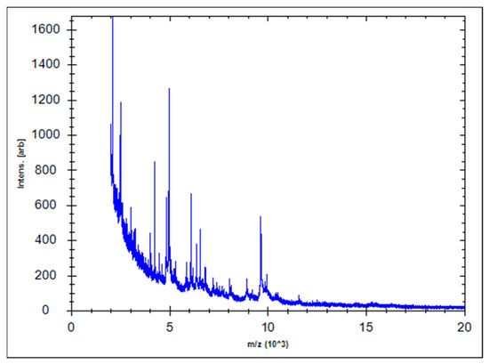 Spectra of S. xylosus generated using MALDI-TOF Bruker Biotyper. The y-axis represents the absolute intensity of the ions and x-axis represents the mass (m/z). The m/z value indicates the mass to charge ratio.