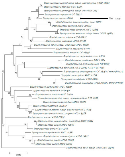 To confirm the identification result, PCR was performed using specific primers designed to diagnose S. xylosus and S. saprophyticus. The PCR results showed that the bacterial strain was only positive for the S. xylosus-specific primer, which binds to its house-keeping gene (sodA). The phylogenetic tree constructed using 38 partial 16S rRNA genes of Staphylococcus spp. also showed that the bacterial strain belongs to the clade of S. xylosus, which supports the fact that the bacterial strain SNU1 is S. xylosus (Figure 3).
