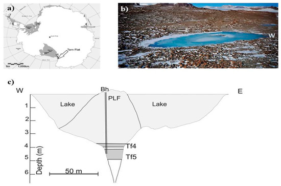 The Tarn Flat (TF) area is the largest ice-free area of the Northern Victoria Land, located near the Italian Antarctic Research Station “Mario Zucchelli” (MZS). The presence of Late Wisconsin’s glacial deposits and outcropping Ordovician granites in the area was previous described [25,26]. The mean annual air temperature (MAAT)—based on observations over the last 20 years—is approximately −14°C, while snow ranges between 100 and 200 mm per year [27,28]. Many lakes characterize the study area and, generally, those located at higher elevations(more than 250 m a.s.l.) are frozen throughout the year or only partially melted during warmer seasons [29].