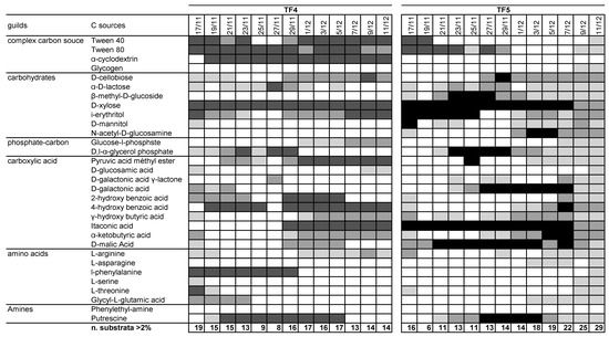 Pattern of utilization of the 31 carbon sources for TF4 and TF5 samples. The box color is indicative of the percentage absorbance range of the total absorbance of the plate. Values are as follows: white < 2%; light grey 2–4%; dark grey 4–6%; black > 6%. Below each column, the number of substrates with greater or equal to 2%, 4% and 6% absorbance for each sample.