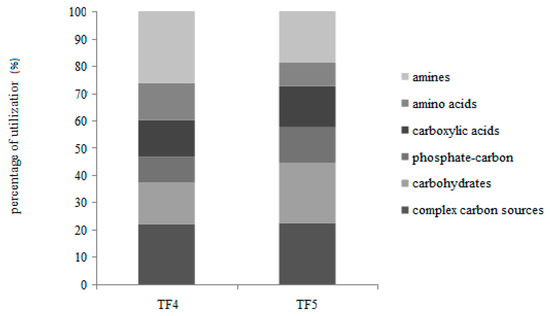 Different utilization patterns of the six guilds were obtained between TF4 and TF5. In particular, with the exception of the complex carbon sources (polymers) that were similarly utilized, the amines and amino acids were preferentially metabolized in TF4, while the carbohydrates, phosphate-carbon sources and carboxylic acids were in TF5.