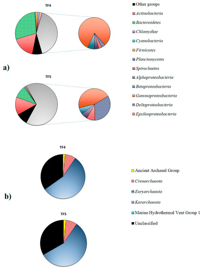 The archaeal communities were mainly constituted by Euryarchaeota (55.8% and 57.1% in TF4 and TF5, respectively), followed by Crenarchaeota (about 7.8% in both samples) and Ancient Archaeal Group (1.6% and 1.8% in TF4 and TF5, respectively). Korarchaeota (0.1% and 0.02% in TF4 and TF5, respectively) and the Marine Hydrothermal Vent Group1 (0.2% and 0.1% in TF4 and TF5, respectively) were less represented. A total of 34.6% and 33.1% of reads were unclassified in TF4 and TF5, respectively (Figure 3b).