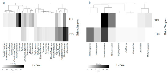 Heatmaps of presence and abundance of bacterial (a) and archaeal (b) genera in the brine samples. Color blocks represent the relative abundance of genera. More darkness indicates a higher relative abundance.
