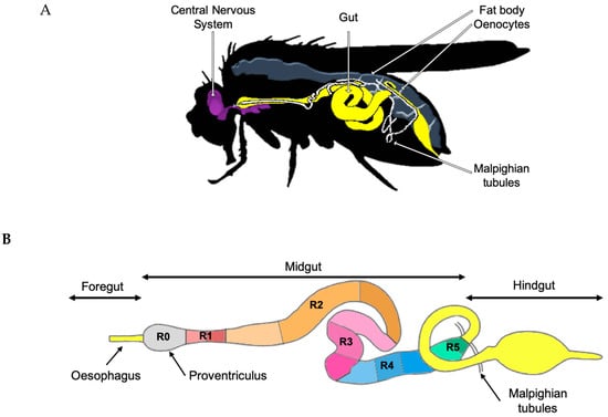 Adult Drosophila melanogaster anatomy. (A) The Drosophila melanogaster model system contains tissues that functionally correspond to most essential human organs: central nervous system, gastrointestinal system, adipose tissue and the liver (synergic function of fat body and oenocytes) and kidneys (Malpighian tubules). (B) The Drosophila melanogaster adult foregut, midgut, and hindgut. The midgut consists of six major anatomical regions (R0–R5) which are further subdivided into 14 color-coded sub-regions (for example, R2 is subdivided into three orange sub-regions) according to morphometric, histochemical and transcriptomic data.