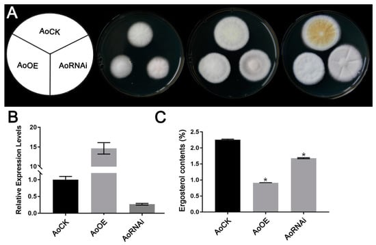 Colony morphologies, AoErg19 expression level, and ergosterol contents in control strain (CK), overexpression (OE), and RNAi strains. (A) Colony morphologies of CK, OE, and RNAi strains on DPY (dextrin-peptone-yeast extract) medium after 48 h, 60 h, or 72 h of incubation. From left to right: scheme showing different transgenic strains, 48 h, 60 h, and 72 h colony morphologies. (B) The relative expression level of AoErg19 in CK, OE, and RNAi strains. (C) Ergosterol content of CK, OE, and RNAi strains. In B and C, values are given as the mean of three replicates plus SE, *p < 0.05.