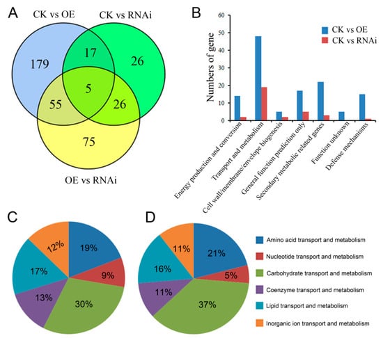 Distribution and classification of DEGs in CK vs. OE, CK vs. RNAi, and OE vs. RNAi. (A) Venn diagram displaying the DEG distribution of samples. (B) COG function classification of DEGs in samples. (C,D) The classification of DEGs involved in transport and metabolism for CK vs OE (C) and CK vs RNAi (D).