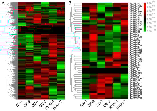 The expression profiles of lipid biosynthesis and metabolism, and ergosterol biosynthesis genes. (A) Expression of genes involved in lipid biosynthesis and metabolism. (B) Expression of genes involved in ergosterol biosynthesis.