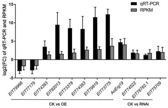 Results show that there are 22 common DEGs (Table 3). Except for EIT82403 and EIT77689, the most common DEGs showed the same trends in CK vs. OE and CK vs. RNAi. Most of the common DEGs were associated with cell membrane proteins or transporters, accounting for 41%; the second were associated with energy production and conversion, and transcription. There were only five commonly shared DEGs among the three groups: EIT76067, EIT82403, EIT76073, EIT77689, and EIT79995.1, which are shown in bold in Table 3. The details regarding expression differences and function of these genes are shown in Table 3.