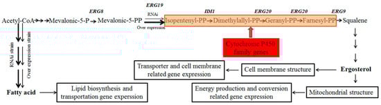 A comparison of DEGs for CK vs. OE and CK vs. RNAi revealed that there were 22 genes affected by both overexpression and RNAi of AoErg19, and only five DEGs were shared among CK vs. OE, CK vs. RNAi, and OE vs. RNAi. Most of the DEGs found were associated with cell membrane proteins or transporters. The second most common were associated with energy production and conversion, and transcription related genes. The changes in energy production and conversion-related genes can be explained by how altered ergosterol content impairs mitochondrial structure [,,]. In investigating the differences of DEGs between CK vs. OE and CK vs. RNAi, a large number of cytochrome P450 family genes were found. For example, there were 12 DEGs associated with the cytochrome P450 family in CK vs. OE, but only 1 was found for CK vs. RNAi. This can be explained by how in the OE strain, the intermediates IPP, dimethylallyl-PP, geranyl diphosphate, or farnesyl-PP could have accumulated, which can be toxic to cells. Therefore, cytochrome P450 family genes may have been regulated to metabolize these intermediates.