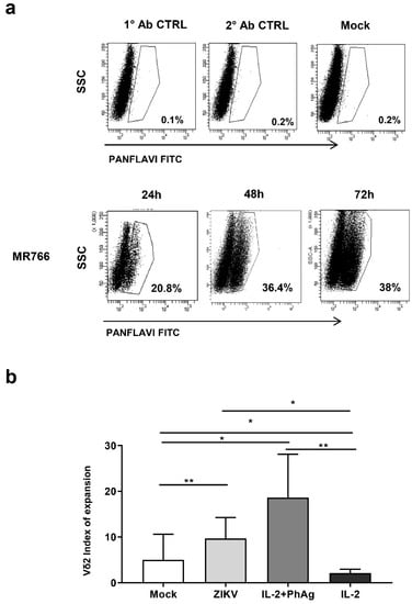 (a) Zika virus (ZIKV) infects A549 cells and elicits expansion of Vδ2 T-cells. A549 cells were infected with ZIKV MR766 strain and the frequency of ZIKV+ cells was analyzed by flow cytometry using the PANFLAVI antibody after 24, 48, and 72 h. Flow cytometry panels of one representative experiment out of 15 are shown. PANFLAVI+ gate was set to include ≤0.2% of events when using primary or secondary antibody isotype controls or uninfected cells (mock). (b) Expansion index of Vδ2 T-cells in co-culture with ZIKV-infected cells was shown. A549 cells were not infected (mock) or infected with ZIKV MR766 and cultured with peripheral blood mononuclear cells (PBMC) of healthy donors (HD). IL-2 or IL-2 + PhAg were added in parallel cultures as controls. Vδ2 T-cells frequency was calculated at baseline (T0) and after 7 days (T7). The expansion index was calculated by dividing Vδ2 T-cells frequency at 7 days in respect to T0. Results from 13 independent experiments are shown. Data were represented as median + interquartile range. * p < 0.05; ** p < 0.01.