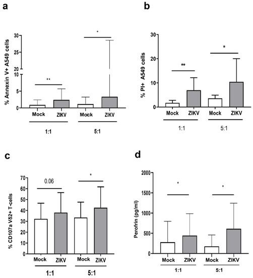 ZIKV sensitized A549 cells to Vδ2 T-cell-mediated killing. (a–c) Expanded Vδ2 T-cells were cultured overnight with mock (white bars) or ZIKV-infected A549 cells (grey bars) cells, at 1:1 and 5:1 ratios. (a,b) After 18 h, apoptotic/necrotic A549 cells were analyzed by measuring AnnexinV and PI expression by flow cytometry (n = 15). (c) The frequency of Vδ2 + /CD107a+ cells was measured after the culture with mock/ZIKV-infected cells (n = 7). (d) Perforin quantification in the supernatants of the same experiments was shown. In all experiments, background (mock/ZIKV+ apoptotic/necrotic cells without expanded Vδ2 T-cells) was subtracted to all conditions. Data were represented as median + interquartile range. * p <0.05; ** p < 0.01.