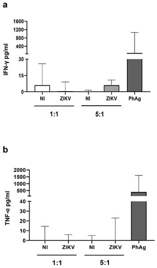 ZIKV-infected A549 cells did not induce IFN-γ and TNF-α production by expanded Vδ2 T-cells. (a,b) Expanded Vδ2 T-cells were cultured overnight with mock (white bars) or ZIKV-infected A549 cells (grey bars) cells, at 1:1 and 5:1 ratios, or stimulated with PhAg (IPH1101 3 µM) as positive control. (a,b) After 18 h, culture supernatants were collected and IFN-γ (n-8) and TNF-α (n-5) were quantified by ELISA assays. Data were subtracted of the background (expanded Vδ2 T-cells alone). Data were represented as median + interquartile range.