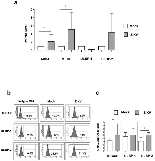 3.3. ZIKV Infection Increased NKG2D Ligand Expression in A549 Cells