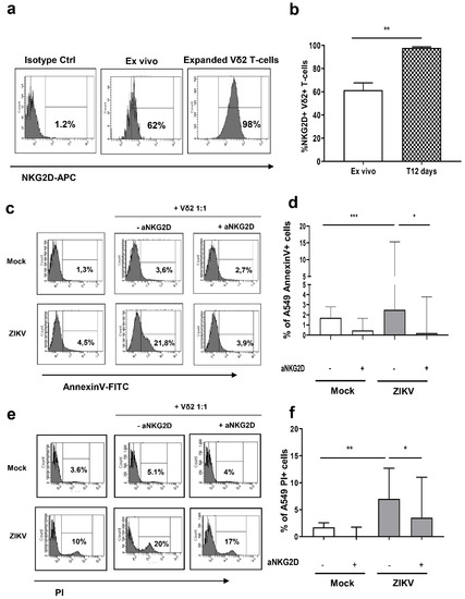 NKG2D triggering by its ligands expressed on target cells transduces a potent activation signal. In order to define the involvement of NKG2D in recognition and killing of ZIKV-infected cells, we firstly analyzed the expression of NKG2D on expanded Vδ2 T-cells. Representative histograms of NKG2D expression are shown in Figure 5A. We found that a large fraction of freshly isolated ex vivo Vδ2 T-cells express NKG2D [median + IQR: 61.5% (48.9–67.6)] that was significantly increased in expanded Vδ2 T-cells [97.9% (82.0–98.7)] (Figure 5B). To verify whether Vδ2 T-cells were able to kill ZIKV-infected cells through NKG2D receptor, we pre-treated Vδ2 T-cells with anti-NKG2D (aNKG2D) neutralizing antibody. Then, we cultured untreated/treated expanded Vδ2 T-cells with mock or ZIKV-infected A549 cells for 18 h and analyzed the frequency of apoptotic cells by flow cytometry. Representative histograms are shown (Figure 5C,E). While untreated- expanded Vδ2 T-cells were able to kill ZIKV-infected cells, pre-treatment of expanded Vδ2 T-cells with aNKG2D antibody completely abrogated the cytotoxic effect (Figure 5D,F) (p < 0.001), indicating that Vδ2 T-cells killing of infected cells is mediated by NKG2D activation.