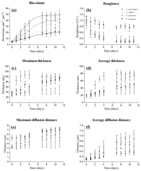 - Heydorn, A.; Nielsen, A.T.; Hentzer, M.; Sternberg, C.; Givskov, M.; Ersbøll, B.K.; Molin, S. Quantification of biofilm structures by the novel computer program COMSTAT. Microbiology 2000, 146, 2395–2407. [Google Scholar] [CrossRef] [PubMed]