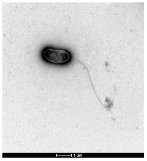 Electron TEM micrograph showing bacterial shape and size and the flagellum of Microvirga brassicacearum CDVBN77T.