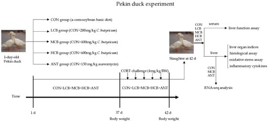 A total of 500 male Pekin ducks (1-day-old) were selected from a local commercial hatchery (Beijing Golden Star Duck Co., Ltd.) and the experiment was performed at the Experimental Center of China Agricultural University. The birds were randomly assigned into five groups (five replicates with twenty birds each) and were raised in a temperature-controlled room. The temperature was controlled at 32 to 34 °C during the first 5 days, and then subsequently declined (about 2–3 °C/week) to a final temperature of 22 °C. All ducks had free access to feed and drinking water with a 23L: 1D lighting system during the experiment. The control group (CON) was fed with a corn-soybean basic diet for 42 d. The other four groups were fed with the basic diet supplemented with 200 mg/kg (LCB), 400 mg/kg (MCB), or 600 mg/kg (HCB) C. butyricum (2.0 × 109 CFU/g) or 150 mg/kg aureomycin (ANT), respectively (Figure 1). The nutrient requirements of the diets were calculated to meet or exceed the National Research Council (NRC, 1994) standards (Table S1). The C. butyricum is available as a freeze-dried powder obtained from Beijing Shine Biology Technology Co., Ltd., China (Batch No. 20170325003).