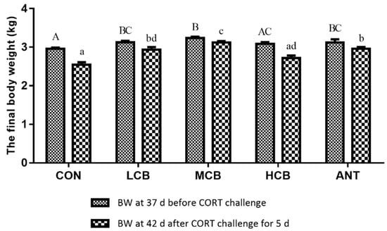 Effects of C. butyricum on body weight (BW) of Pekin ducks at 37 d before corticosterone (CORT) challenge and 42 d after CORT challenge for 5 d, respectively. The data were showed as mean ± S.D. A, B, C was used to show the differences among groups at 37 d before CORT challenge and the different superscript capital letter indicated significant difference (p < 0.05) between any two groups at 37 d before CORT challenge. a, b, c, d was used to show the differences among groups at 42 d after CORT challenge for 5 d and the different superscript small letter indicated significant difference (p < 0.05) between any two groups at 42 d after CORT challenge for 5 d.