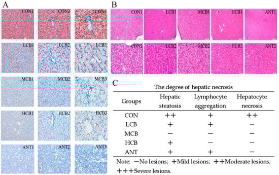 The histological sections stained with hematoxylin-eosin (H&E) (Figure 3A) and Oil Red O (Figure 3B) both indicated that lipid accumulation severely increased at 42 d after the CORT challenge, but this increase was drastically attenuated in the C. butyricum-supplemented groups and the ANT group. Additionally, hepatic steatosis, lymphocyte aggregation, severe hepatocyte necrosis, and inflammatory cell infiltration especially around the central veins were observed in the CON group liver after CORT challenge. However, these pathological changes were clearly attenuated by C. butyricum intervention, especially in the MCB group. The relieved degree of hepatic steatosis, lymphocyte aggregation and hepatocyte necrosis were presented in the Figure 3C.