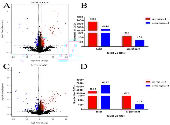 The volcano plot and numbers of DEGs. (A) The volcano plot between the MCB and CON groups. (B) The numbers of the DEGs between the MCB and CON groups. (C) The volcano plot between the MCB and ANT groups. (D) The numbers of the DEGs between the MCB and ANT groups. (A,C): Red dots (Up) represent significantly up-regulated genes (p < 0.05, fold change ≥ 2); blue dots (Down) represent significantly down-regulated genes (p < 0.05, fold change ≤ 0.5); black dots (No) represent insignificantly DEGs. (B,D): The first two columns represent the total number of up-regulated genes (p < 0.05 and p ≥ 0.05, fold change ≥ 2) or down-regulated genes (p < 0.05 and p ≥ 0.05, fold change ≤ 0.5), respectively; the second two columns represent the number of up-regulated genes (p < 0.05, fold change ≥ 2) or down-regulated genes (p < 0.05, fold change ≤ 0.5), respectively.